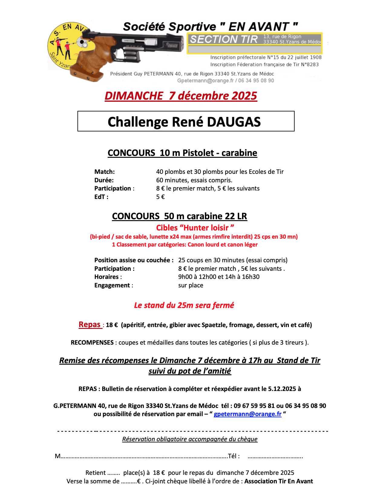 - 10 m / 25 m / 50 m / réservation auprès de Guy PETERMANN (06 34 95 08 90 ou 09 67 59 95 81)
