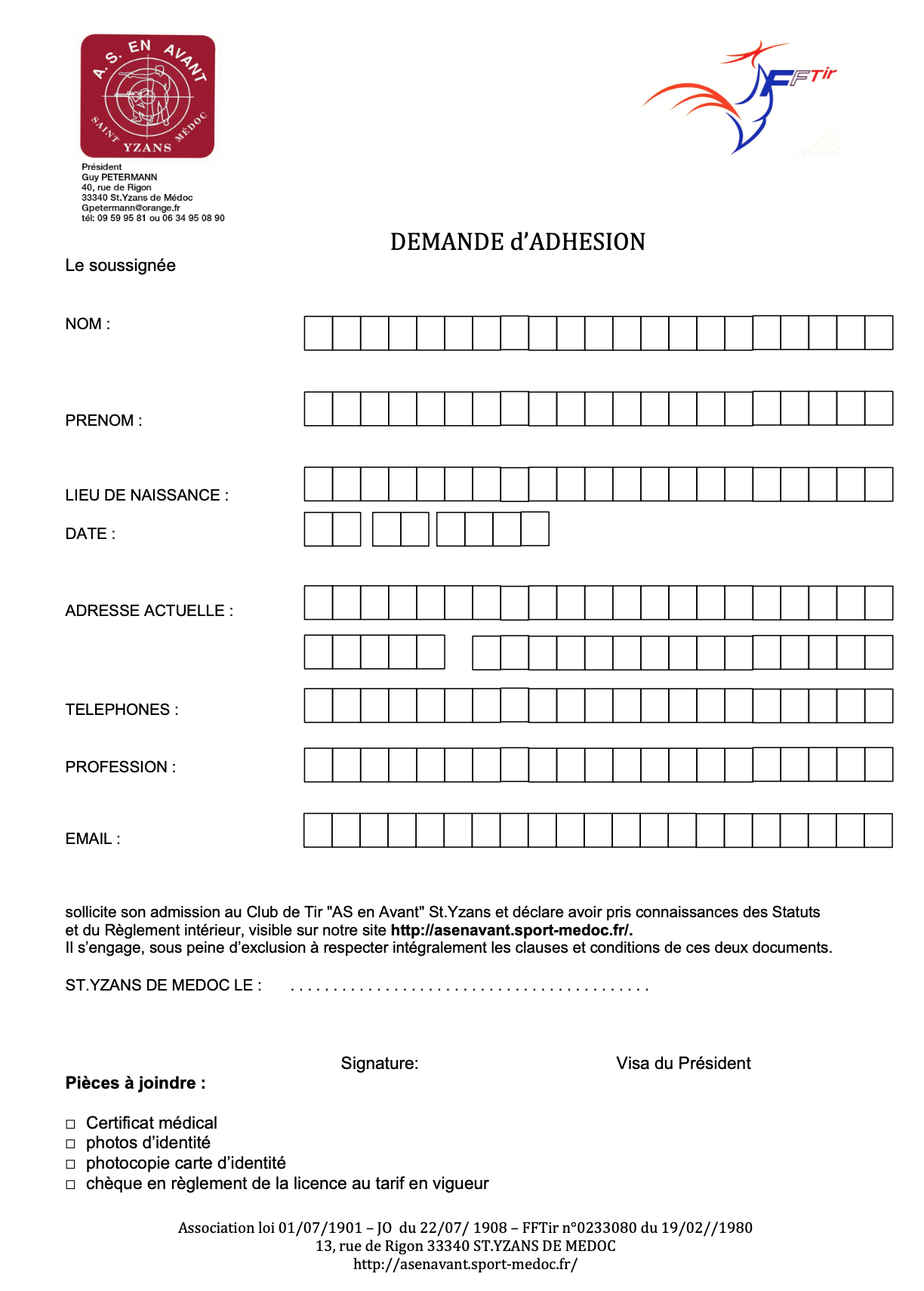 A l’issue de ses essais, si cette personne désire adhérer à l’Association du Club de Tir de St YZANS de Médoc, pour bénéficier nominativement, d’une licence de la Fédération Française de Tir, pour l’année sportive en cours, elle doit remplir notre formulaire d’adhésion